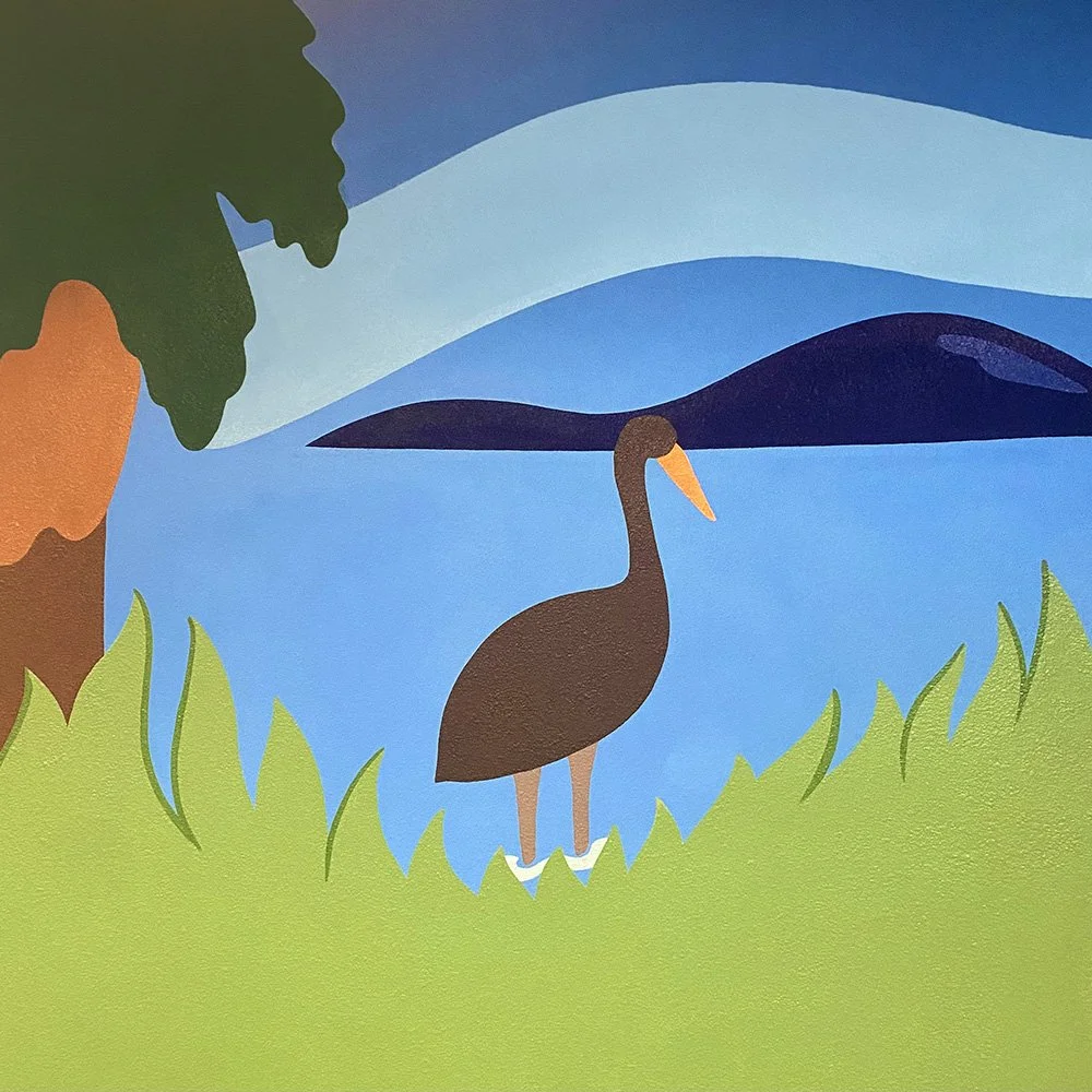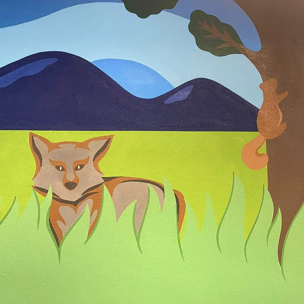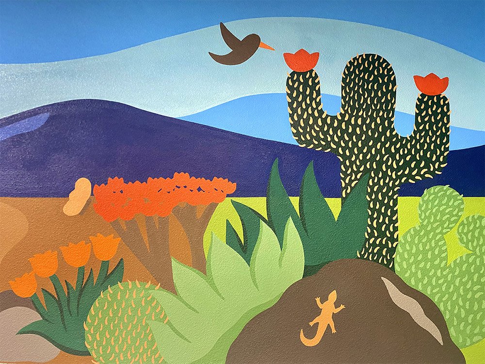 At the heart of this story time nook for children of all ages, this mural is inspired by the diverse natural landscape of Chula Vista, from mountains to marshlands. The design features native wildlife - including plants, pollinators, and predators - scattered throughout the scene for children to discover. This project was funded by the Create Chula Vista Arts Grant with the goal of creating a welcoming environment for children and families to engage with books and each other.
